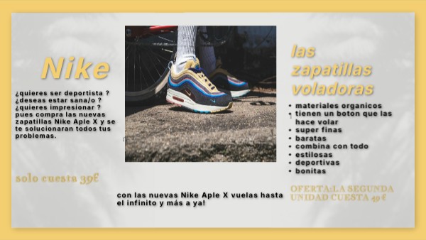 ¿quieres ser deportista ? ¿deseas estar sana/o ? ¿quieres impresionar ? pues compra las nuevas zapatillas Nike Aple X y se te solucionaran todos tus problemas.