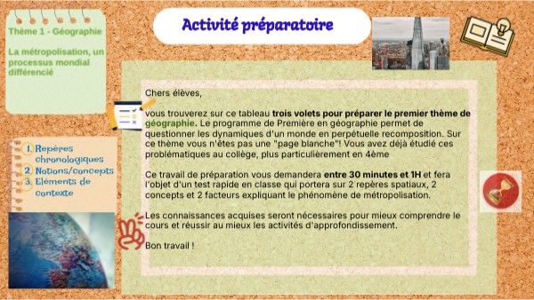 Chers élèves, vous trouverez sur ce tableau trois volets pour préparer le premier thème de géographie. Le programme de Première en géographie permet de questionner les dynamiques d'un monde en perpétuelle recomposition. Sur ce thème vous n'êtes pas une "page blanche"! Vous avez déjà étudié ces problématiques au collège, plus particulièrement en 4ème Ce travail de préparation vous demandera entre 30 minutes et 1H et fera l'objet d'un test rapide en classe qui portera sur 2 repères spatiaux, 2 concepts et 2 facteurs expliquant le phénomène de métropolisation. Les connaissances acquises seront nécessaires pour mieux comprendre le cours et réussir au mieux les activités d'approfondissement. Bon travail !