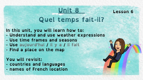 In this unit, you will learn how to: - Understand and use weather expressions - Use time frames and seasons - Use aujourd'hui / il y a / il fait - Find a place on the map You will revisit: - countries and languages - names of French location