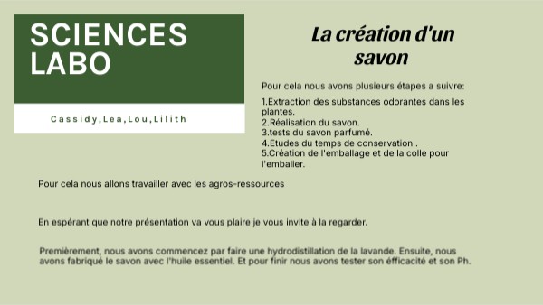 1.Extraction des substances odorantes dans les plantes. 2.Réalisation du savon. 3.tests du savon parfumé. 4.Etudes du temps de conservation . 5.Création de l'emballage et de la colle pour l'emballer.