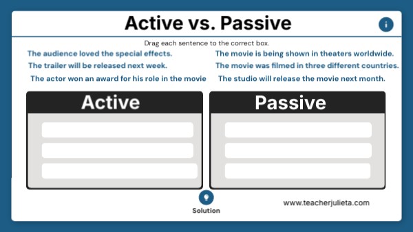 š Instructions: Sorting Active & Passive Sentences š Read each sentence carefully. š§ Decide if itās active or passive. āDrag the active sentences under "Active" and the passive ones under "Passive." š”Remember: Active: The subject does the action . Passive: The subject receives the action ā Check your answers by clicking "Solution"