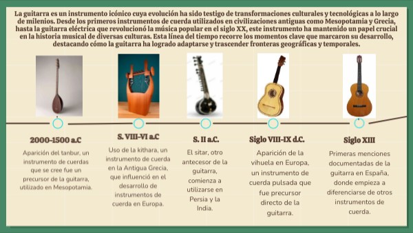 La guitarra es un instrumento icónico cuya evolución ha sido testigo de transformaciones culturales y tecnológicas a lo largo de milenios. Desde los primeros instrumentos de cuerda utilizados en civilizaciones antiguas como Mesopotamia y Grecia, hasta la guitarra eléctrica que revolucionó la música popular en el siglo XX, este instrumento ha mantenido un papel crucial en la historia musical de diversas culturas. Esta línea del tiempo recorre los momentos clave que marcaron su desarrollo, destacando cómo la guitarra ha logrado adaptarse y trascender fronteras geográficas y temporales.