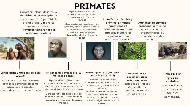 Cenozoica(65 millones de años atrás):Características: los primeros primates comenzaron como criaturas arborícolas, adaptados a vivir en los árboles