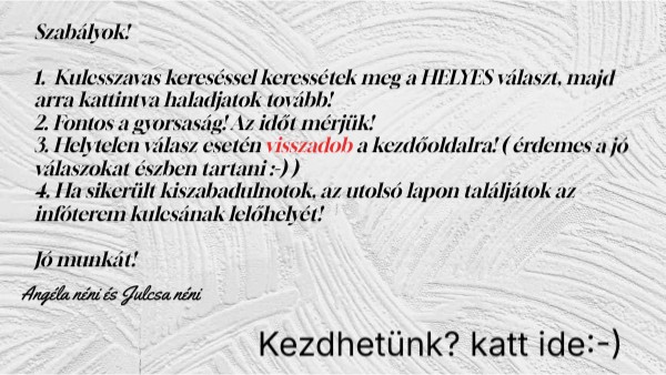 Szabályok! 1. Kulcsszavas kereséssel keressétek meg a HELYES választ, majd arra kattintva haladjatok tovább! 2. Fontos a gyorsaság! Az időt mérjük! 3. Helytelen válasz esetén visszadob a kezdőoldalra! ( érdemes a jó válaszokat észben tartani :-) ) 4. Ha sikerült kiszabadulnotok, az utolsó lapon találjátok az infóterem kulcsának lelőhelyét! Jó munkát!