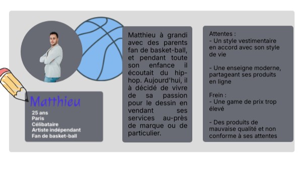 Attentes : - Un style vestimentaire en accord avec son style de vie - Une enseigne moderne, partageant ses produits en ligne Frein : - Une game de prix trop élevé - Des produits de mauvaise qualité et non conforme à ses attentes