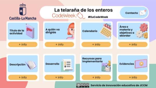 El reto "La telaraña de los números enteros" es una propuesta del Servicio de Innovación Educativa de JCCM que tiene como objetivo iniciar al alumnado en la programación en Scratch utilizando las matemáticas y, en particular, los números enteros. Aunque se puede realizar en cualquier momento del curso, se puede contextualizar en fechas aproximadas a Halloween, ya que se utilizan las telarañas como decoración en los diferentes lugares en los que se ubica el alumnado como por ejemplo: en casa, en el centro educativo, etc..., Además, dichas fechas suelen coincidir con el aprendizaje de los números enteros por parte del alumnado. Manipularán los diferentes bloques de programación en Scracth, relacionándolos con las operaciones y visualizándolos gráficamente consiguiendo de esta forma trabajar