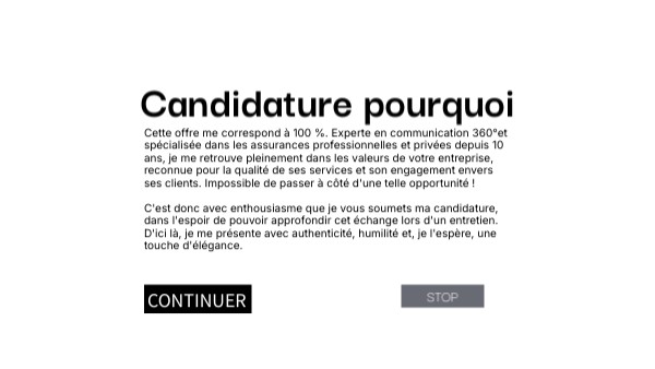 Une offre riche qui s'impose à moi comme une réelle opportunité d'évolution. Experte en Marketing stratégique, produits et communication 360°je suis spécialisée dans les assurances professionnelles et privées depuis plus de 10 ans. Manager de proximité depuis 2 ans d'une équipe de 7 personnes aux profils variés je me retrouve dans de nombreux aspects de votre offre et pleineement dans les vlauers de votre entreprise, connu et reconnu comme pour la qualité de ses services et son engagement envers ses clients et humaine, Impossible de passer à côté d'une telle opportunité ! C'est donc avec enthousiasme que je vous soumets ma candidature, dans l'espoir de pouvoir approfondir cet échange lors d'un entretien. D'ici là, je me présente avec authenticité, humilité et, je l'espère, une touche d'élégance.