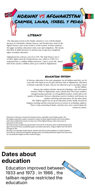 In Norway, education is free and compulsory for all children until they are 16 years old, with equal access for girls and boys. But in Afghanistan, education is limited, especially for girls, who are not allowed to go to secondary school by the Taliban. Norway has modern schools, advanced technology, and well-trained teachers. While in Afghanistan, many schools don't have basic facilities, enough learning materials, or well-qualified teachers, which affects the quality of education. Norway’s education system is inclusive and focuses on student well-being and innovation. On the other hand, The Taliban regime has set up an education system mainly focused on religious teaching and has restricted access to science or technology subjects. There is also censorship of books, and they have strict control about the content in classes.