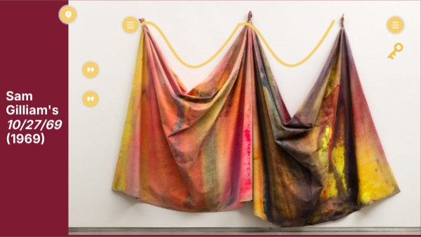 Sam Gilliam, a Washington DC native passed around 2 years ago. His artistry was particularly inspired by what he called the musical genre of jazz's elements of improvisation. Other artists and creators have noted the paradigm shift he specifically contributed to in regards to color school. This piece entitled 10/27/69, highlights a day in history in which American society was deeply divided by the Vietnam War and racial tensions. The piece itself was made by draping fabric and letting paint drip onto it. Suggesting the ways in which creating has a spirtual transcendence beyond the creator's control at times.