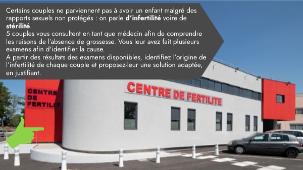 Certains couples ne parviennent pas à avoir un enfant malgré des rapports sexuels non protégés : on parle d’infertilité voire de stérilité. 5 couples vous consultent en tant que médecin afin de comprendre les raisons de l’absence de grossesse. Vous leur avez fait plusieurs examens afin d'identifier la cause. A partir des résultats des examens disponibles, identifiez l’origine de l’infertilité de chaque couple et proposez-leur une solution adaptée, en justifiant.