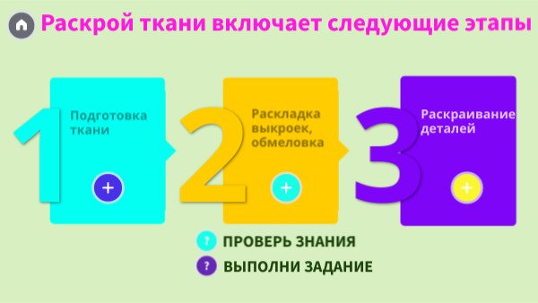 Проверь!Наличие всех деталей, правильность раскладки с учетом нити основы и рисунка ткани. Совмещение сгиба ткани с выкройкой.