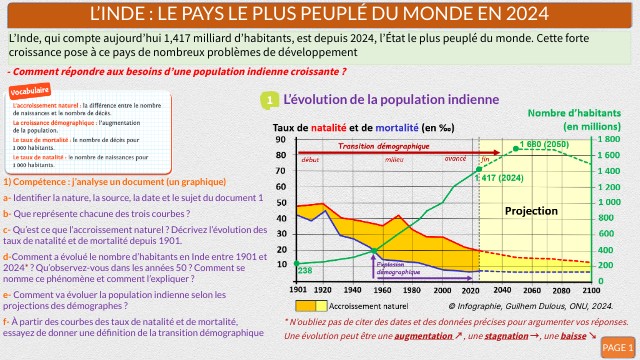 1) Compétence : j’analyse un document (un graphique) a- Identifier la nature, la source, la date et le sujet du document 1 b- Que représente chacune des trois courbes ? c- Qu’est ce que l’accroissement naturel ? Décrivez l’évolution des taux de natalité et de mortalité depuis 1901. d-Comment a évolué le nombre d’habitants en Inde entre 1901 et 2024* ? Qu’observez-vous dans les années 50 ? Comment se nomme ce phénomène et comment l’expliquer ? e- Comment va évoluer la population indienne selon les projections des démographes ? f- À partir des courbes des taux de natalité et de mortalité, essayez de donner une définition de la transition démographique