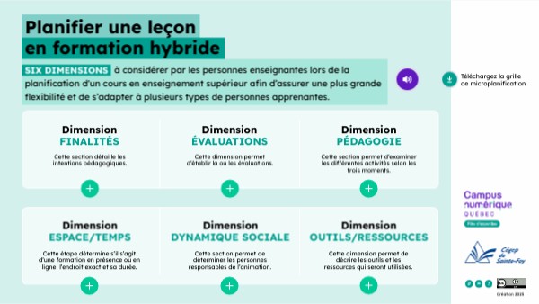 Sauvageau, G. et le Pôle d’expertise interordres et formation à distance (mars 2025). Guide d’accompagnement de l’outil de microplanification d’une leçon en formation hybride. Cégep de Sainte-Foy et Campus numérique Québec. CC BY 4.0 international. https://view.genially.com/6707a4c9ffec31af69e37989