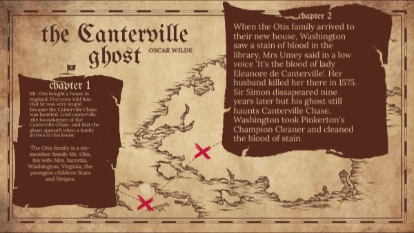 When the Otis family arrived to their new house, Washington saw a stain of blood in the library, Mrs Umey said in a low voice 'It's the blood of lady Eleanore de Canterville'. Her husband killed her there in 1575. Sir Simon dissapeared nine years later but his ghost still haunts Canterville Chase. Washington took Pinkerton's Champion Cleaner and cleaned the blood of stain.