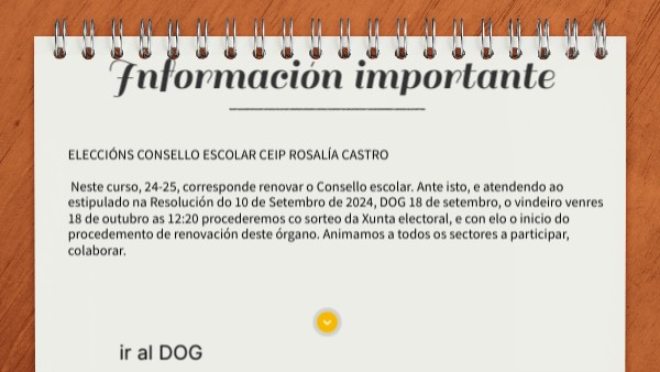 ELECCIÓNS CONSELLO ESCOLAR CEIP ROSALÍA CASTRO Neste curso, 24-25, corresponde renovar o Consello escolar. Ante isto, e atendendo ao estipulado na Resolución do 10 de Setembro de 2024, DOG 18 de setembro, o vindeiro venres 18 de outubro as 12:20 procederemos co sorteo da Xunta electoral, e con elo o inicio do procedemento de renovación deste órgano. Animamos a todos os sectores a participar, colaborar.