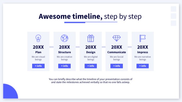 You can briefly describe what the timeline of your presentation consists of and state the milestones achieved verbally so that no one falls asleep.
