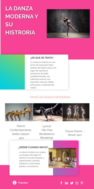 t.La danza moderna es una forma de expresión física distinta del ballet clásico. En lugar de reproducir posiciones de baile predeterminadas, los bailarines buscan una expresión real que refleje emociones y experiencias vitales.