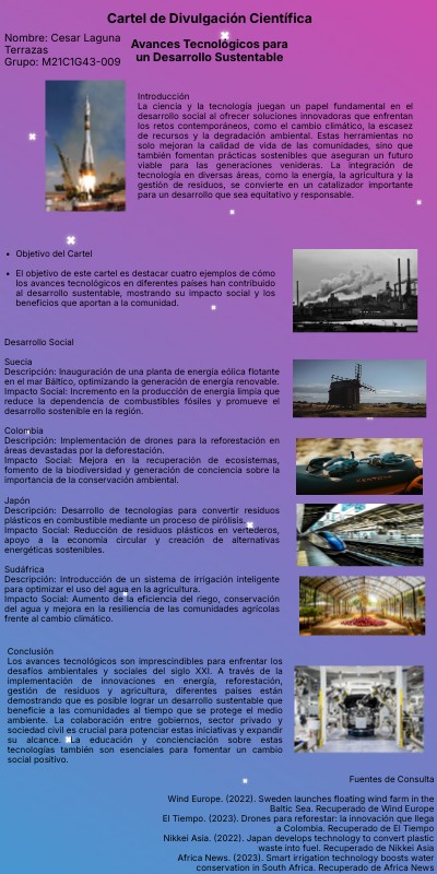 - El objetivo de este cartel es destacar cuatro ejemplos de cómo los avances tecnológicos en diferentes países han contribuido al desarrollo sustentable, mostrando su impacto social y los beneficios que aportan a la comunidad.