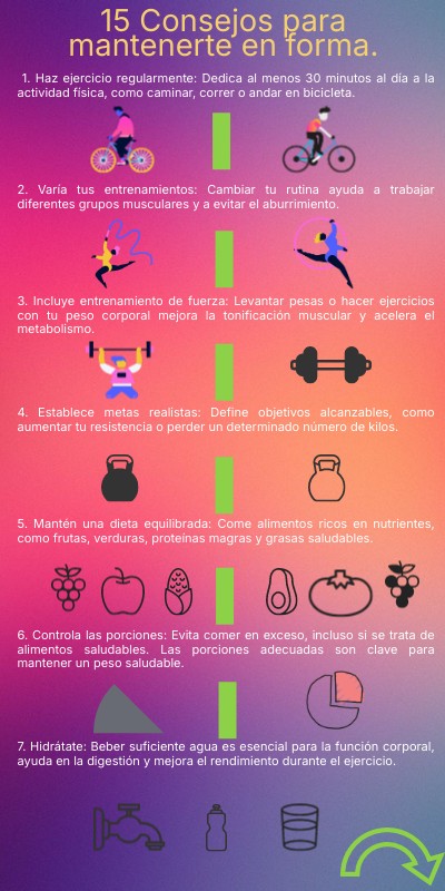 1. Haz ejercicio regularmente: Dedica al menos 30 minutos al día a la actividad física, como caminar, correr o andar en bicicleta. 2. Varía tus entrenamientos: Cambiar tu rutina ayuda a trabajar diferentes grupos musculares y a evitar el aburrimiento. 3. Incluye entrenamiento de fuerza: Levantar pesas o hacer ejercicios con tu peso corporal mejora la tonificación muscular y acelera el metabolismo. 4. Establece metas realistas: Define objetivos alcanzables, como aumentar tu resistencia o perder un determinado número de kilos. 5. Mantén una dieta equilibrada: Come alimentos ricos en nutrientes, como frutas, verduras, proteínas magras y grasas saludables. 6. Controla las porciones: Evita comer en exceso, incluso si se trata de alimentos saludables. Las porciones adecuadas son clave para mantener un peso saludable. 7. Hidrátate: Beber suficiente agua es esencial para la función corporal, ayuda en la digestión y mejora el rendimiento durante el ejercicio.