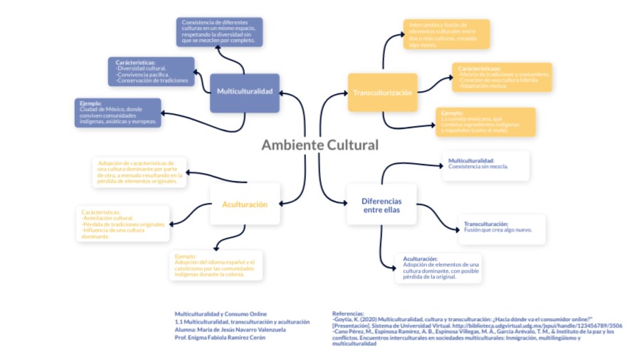 Referencias:-Goytia, K. (2020) Multiculturalidad, cultura y transculturación: ¿Hacia dónde va el consumidor online?” [Presentación]. Sistema de Universidad Virtual. http://biblioteca.udgvirtual.udg.mx/jspui/handle/123456789/3506 -Cano Pérez, M., Espinosa Ramírez, A. B., Espinosa Villegas, M. Á., García Arévalo, T. M., & Instituto de la paz y los conflictos. Encuentros interculturales en sociedades multiculturales: Inmigración, multilingüismo y multiculturalidad