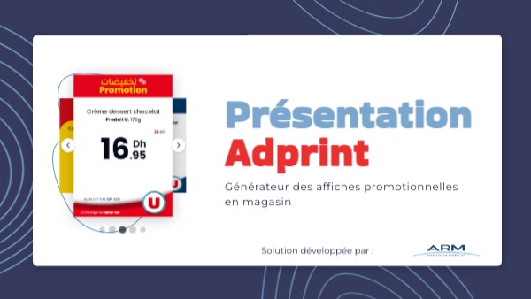 Adprint est une application de génération des affiches promotionnelles à l'usage des magasins. Que ce soit pour une promotion interne du magasin ou du dépliant, Adprint permet de centraliser, uniformiser et modifier les affiches du magasin pour réutilisation.