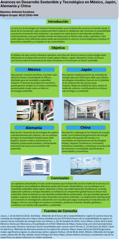 Los ejemplos presentados en este cartel muestran que el desarrollo social a través de la ciencia y la tecnología es una realidad en diferentes partes del mundo. Desde México, con su enfoque en la movilidad sostenible, hasta Japón, Alemania y China, que están liderando iniciativas en vivienda, captura de carbono y energía renovable, se evidencia un compromiso global hacia un futuro más sostenible. Estas iniciativas no solo abordan problemáticas ambientales, sino que también generan empleo, mejoran la calidad de vida y fomentan economías resilientes. La colaboración internacional y la inversión en investigación y desarrollo son cruciales para seguir avanzando en esta dirección. Al integrar ciencia y tecnología en nuestras sociedades, podemos enfrentar desafíos globales y contribuir a un mundo más equitativo y sostenible.