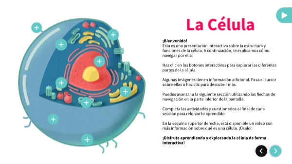 ¡Bienvenido!Esta es una presentación interactiva sobre la estructura y funciones de la célula. A continuación, te explicamos cómo navegar por ella: Haz clic en los botones interactivos para explorar las diferentes partes de la célula. Algunas imágenes tienen información adicional. Pasa el cursor sobre ellas o haz clic para descubrir más. Puedes avanzar a la siguiente sección utilizando las flechas de navegación en la parte inferior de la pantalla. Completa las actividades y cuestionarios al final de cada sección para reforzar lo aprendido. En la esquina superior derecha, está disponible un video con más información sobre qué es una célula. ¡Úsalo! ¡Disfruta aprendiendo y explorando la célula de forma interactiva!