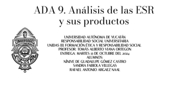 UNIVERSIDAD AUTÓNOMA DE YUCATÁN RESPONSABILIDAD SOCIAL UNIVERSITARIA UNIDAS III. FORMACIÓN ÉTICA Y RESPONSABILIDAD SOCIAL PROFESOR: TOMÁS ALBERTO VIANA ORTEGON ENTREGA: MARTES 15 DE OCTUBRE DEL 2024 ALUMNOS: NÍNIVE DE GUADALUPE GÓMEZ CASTRO SANDRA FABIOLA VILLEGAS RAFAEL ANTONIO ARGAEZ NAAL