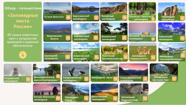 Наши первобытные предки сильно удивились бы, узнав, что через много лет на планете появятся места, закрытые для посещения. Может быть, поэтому многих животных и растений тех времен мы уже никогда не увидим. Сейчас люди ответственнее подходят к охране природы, так появилисьнациональные парки и заповедники. Заповедники – это важная часть сбережения окружающей среды. В России больше 100 таких участков заповедной природы с уникальным миром птиц, зверей и растений. Для их сохранения заповедникам дают статус биосферных, многие имеют официальный статус государственных, которые контролируются на высшем уровне. Однако и о туристах, мечтающих хоть одним глазком взглянуть на красоту и экзотику, тоже не забыли. Для них организуют экологические тропы, маршруты и отдельные локации, где под строгим контролем можно увидеть нерукотворную красоту и величие природы. И вот 25 мест, которые стоит посетить.