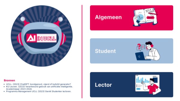 We kiezen ervoor om in ons UCLL-onderwijs generatieve AI (genAI) verantwoord te gebruiken in plaats van het te verbieden. Wanneer studenten afstuderen, komen ze immers terecht in een wereld waarin deze tools ook gebruikt worden.