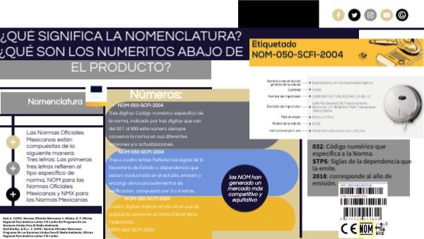 Las Normas Oficiales Mexicanas están compuestas de la siguiente manera: Tres letras: Las primeras tres letras refieren al tipo específico de norma, NOM para las Normas Oficiales Mexicanas y NMX para las Normas Mexicanas