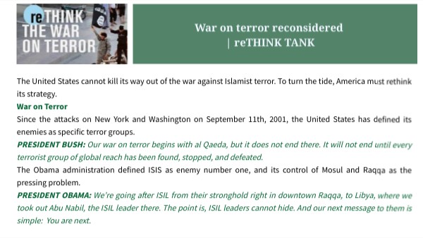 The United States cannot kill its way out of the war against Islamist terror. To turn the tide, America must rethink its strategy.War on TerrorSince the attacks on New York and Washington on September 11th, 2001, the United States has defined its enemies as specific terror groups.PRESIDENT BUSH: Our war on terror begins with al Qaeda, but it does not end there. It will not end until every terrorist group of global reach has been found, stopped, and defeated.The Obama administration defined ISIS as enemy number one, and its control of Mosul and Raqqa as the pressing problem.PRESIDENT OBAMA: We’re going after ISIL from their stronghold right in downtown Raqqa, to Libya, where we took out Abu Nabil, the ISIL leader there. The point is, ISIL leaders cannot hide. And our next message to them is simple: You are next.