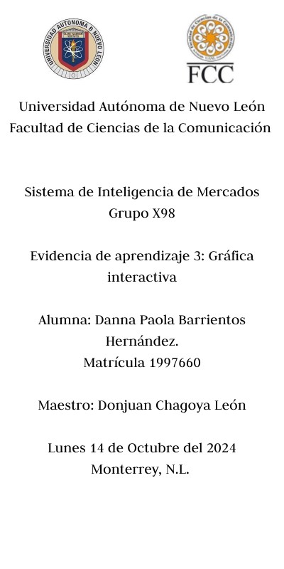 Universidad Autónoma de Nuevo León Facultad de Ciencias de la Comunicación Sistema de Inteligencia de Mercados Grupo X98 Evidencia de aprendizaje 3: Gráfica interactiva Alumna: Danna Paola Barrientos Hernández. Matrícula 1997660 Maestro: Donjuan Chagoya León Lunes 14 de Octubre del 2024 Monterrey, N.L.