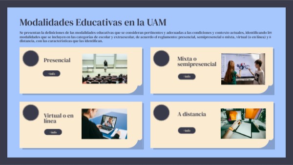 En el contexto de la legislación UAM, esta modalidad se considera parte de la educación extraescolar o remota. Se pueden emplear diversos medios para llevar a cabo el proceso de enseñanza-aprendiza- je. Antes del surgimiento de Internet, la radio y la televisión fueron los medios útiles para ese fin. Con la presencia del Internet, la educación a distancia preferentemente se lleva a cabo por este medio. Como su nombre lo indica, es la modalidad educativa en la que el alumnado y el profesorado no comparten el mismo espacio, dando la posibilidad de participar del PEA desde diferentes sitios, ya sea de forma sincrónica (al mismo tiempo), generalmente, o asíncrona (en momentos distintos), lo que dependerá de la tecnología que se use para mediar el proceso educativo (correo postal o electrónico, una herramienta de video comunicación, clases pregrabadas o en tiempo real (como en las telesecundarias). En el caso de la UAMI, esta modalidad se observa mayormente en clases impartidas en tiempo real a través de un recurso de videocomunicación (Zoom, Google meet, etc.). CARACTERÍSTICAS: