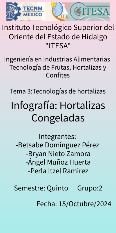 Contaminación Biológica: acterias patógenas: Salmonella, Listeria monocytogenes, Escherichia coli (E. coli) y Clostridium botulinum. Las hortalizas congeladas pueden estar contaminadas por estas bacterias si no se manejan adecuadamente antes del congelamiento. Hongos y mohos: Aspergillus y Penicillium son algunos ejemplos de hongos que pueden crecer en hortalizas si las condiciones de almacenamiento no son óptimas. Virus: Hepatitis A y norovirus, que se transmiten principalmente por contacto humano o agua contaminada.Contaminación química Residuos de pesticidas: Uso excesivo o inadecuado de pesticidas durante el cultivo de las hortalizas. Metales pesados: Presencia de metales como plomo, cadmio, o mercurio en el agua de riego o el suelo donde se cultivan las hortalizas. Contaminación por aditivos: Uso de aditivos no autorizados o en cantidades excesivas durante el procesamiento y conservación de los productos derivados de hortalizas. Migración de envases: Sustancias tóxicas que pueden migrar de los materiales de empaque a las hortalizas congeladas, especialmente si los envases no son aptos para contacto con alimentos.Contaminación física: Fragmentos de vidrio, metal o plástico: Provocados por fallas en el equipo de procesamiento. Restos de tierra o piedras: Si no se lavan adecuadamente antes del procesamiento. Insectos o sus partes: Que pueden quedar atrapados durante la cosecha y no eliminarse correctamente.