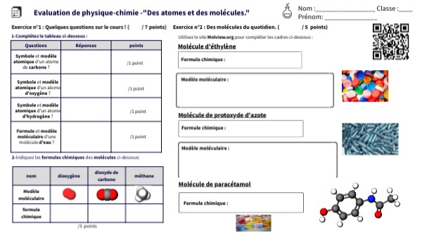 Evaluation de physique-chimie -"Des atomes et des molécules."
