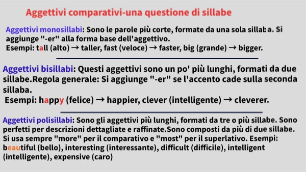 Aggettivi bisillabi: Questi aggettivi sono un po' più lunghi, formati da due sillabe.Regola generale: Si aggiunge "-er" se l'accento cade sulla seconda sillaba. Esempi: happy (felice) → happier, clever (intelligente) → cleverer.
