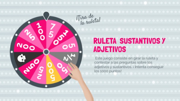 Este juego consiste en girar la ruleta y contestar a las preguntas sobre los adjetivos y sustantivos. ¡ Intenta conseguir los 1000 puntos!