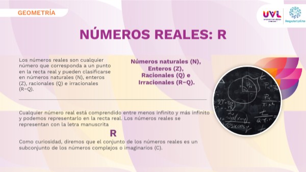 Cualquier número real está comprendido entre menos infinito y más infinito y podemos representarlo en la recta real. Los números reales se representan con la letra manuscrita Como curiosidad, diremos que el conjunto de los números reales es un subconjunto de los números complejos o imaginarios (C).