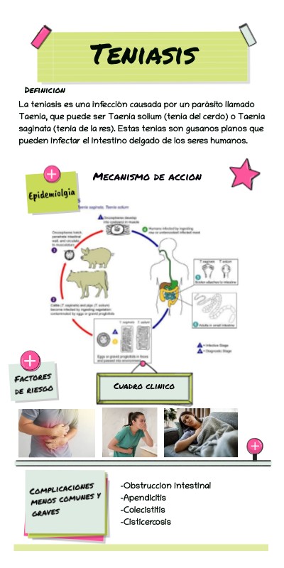 La teniasis es una infección causada por un parásito llamado Taenia, que puede ser Taenia solium (tenia del cerdo) o Taenia saginata (tenia de la res). Estas tenias son gusanos planos que pueden infectar el intestino delgado de los seres humanos.