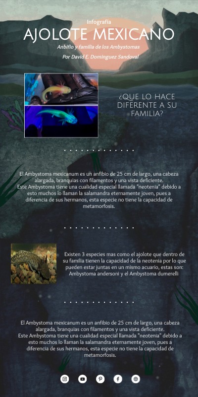 Bibliografia: Ajolote . (s/f). Faunia, el Parque Temático de la Naturaleza. Recuperado el 15 de octubre de 2024, de https://www.faunia.es/planea-tu-visita/animales/ajolote de Medio Ambiente y Recursos Naturales, S. (s/f). Ajolote mexicano, criatura súper dotada . gob.mx. Recuperado el 15 de octubre de 2024, de https://www.gob.mx/semarnat/articulos/ajolote-mexicano-criatura-super-dotada