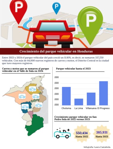 Entre 2023 y 2024 el parque vehicular del país creció un 11.81%, es decir, se sumaron 337,250 vehículos. Con más de 64,000 nuevos registros de carros y motos, el Distrito Central es la ciudad que tuvo mayores registros.