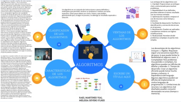 Los algoritmos se pueden clasificar de varias maneras según diferentes criterios: 1. Por su estructura: Algoritmos secuenciales: Ejecutan instrucciones una tras otra. Algoritmos condicionales: Incluyen decisiones que pueden cambiar el flujo de ejecución. Algoritmos iterativos: Repiten un bloque de instrucciones varias veces (bucles). Algoritmos recursivos: Llaman a sí mismos para resolver subproblemas más pequeños. 2. Por su complejidad: Algoritmos de complejidad constante: Su tiempo de ejecución no cambia con el tamaño de la entrada (O(1)). Algoritmos de complejidad logarítmica: El tiempo de ejecución crece lentamente con respecto al tamaño de la entrada (O(log n)). Algoritmos de complejidad lineal: El tiempo de ejecución crece proporcionalmente al tamaño de la entrada (O(n)). Algoritmos de complejidad polinómica: Su tiempo crece con una función polinómica del tamaño de la entrada (O(n^k)). Algoritmos de complejidad exponencial: El tiempo de ejecución crece exponencialmente con el tamaño de la entrada (O(2^n)). 3. Por el tipo de resultado: Algoritmos deterministas: Siempre producen el mismo resultado para una entrada dada. Algoritmos no deterministas: Pueden producir resultados diferentes para la misma entrada. 4. Por su diseño o enfoque: Algoritmos voraces: Eligen la mejor opción disponible en cada paso. Algoritmos divide y vencerás: Dividen el problema en subproblemas más pequeños. Algoritmos dinámicos: Resuelven problemas optimizando soluciones previas. Algoritmos backtracking: Exploran todas las soluciones posibles descartando aquellas que no cumplen con las restricciones. Algoritmos probabilísticos: Utilizan decisiones aleatorias durante su ejecución. Esta clasificación varía según el contexto y el tipo de problema a resolver.