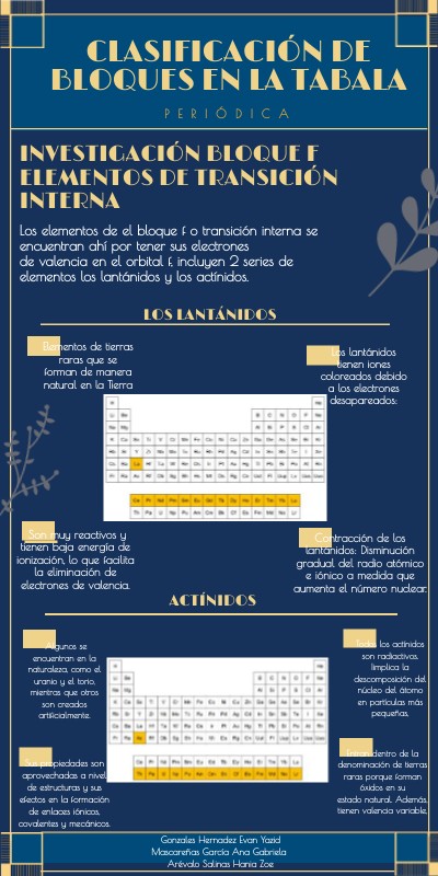 Los elementos de el bloque f o transición interna se encuentran ahí por tener sus electrones de valencia en el orbital f, incluyen 2 series de elementos los lantánidos y los actínidos.