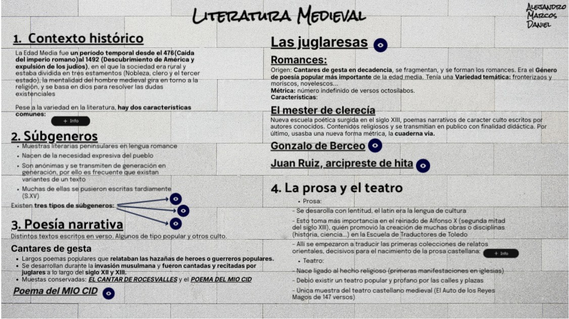 La Edad Media fue un período temporal desde el 476(Caida del imperio romano)al 1492 (Descubrimiento de América y expulsión de los judios), en el que la sociedad era rural y estaba dividida en tres estamentos (Nobleza, clero y el tercer estado), la mentalidad del hombre medieval gira en torno a la religión, y se basa en dios para resolver las dudas existenciales Pese a la variedad en la literatura, hay dos características comunes:
