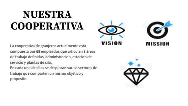 La cooperativa de granjeros actualmente esta compuesta por 68 empleados que articulan 3 áreas de trabajo definidas, administracion, estacion de servicio y plantas de silo.En cada una de ellas se desglozan varios sectores de trabajo que comparten un mismo objetivo y proposito.