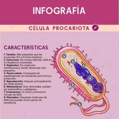 1. Tamaño: Más pequeñas que las eucariotas (0.1 a 5.0 micrómetros).2. Estructura: Sin núcleo definido; ADN en el citoplasma (nucleoide). 3. Orgánulos: Sin orgánulos membranosos; tienen ribosomas más pequeños. 4. Pared celular: Compuesta de peptidoglicano (en bacterias) para forma y protección. 5. Reproducción: Asexual, principalmente por fisión binaria. 6. Metabolismo: Gran diversidad; pueden ser extremófilos o patógenos. 7. Cromosoma: Un único cromosoma circular de ADN. 8. Plásmidos: Pequeñas moléculas de ADN que pueden incluir genes de resistencia.