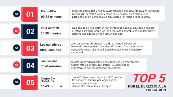 ¡Aparece Camis&Co y nos deja asombradas al resolver la caja en un tiempo record! ¿Su secreto? Niños y niñas en su equipo. Está claro que la participación de la infancia es clave para el derecho a la educación.