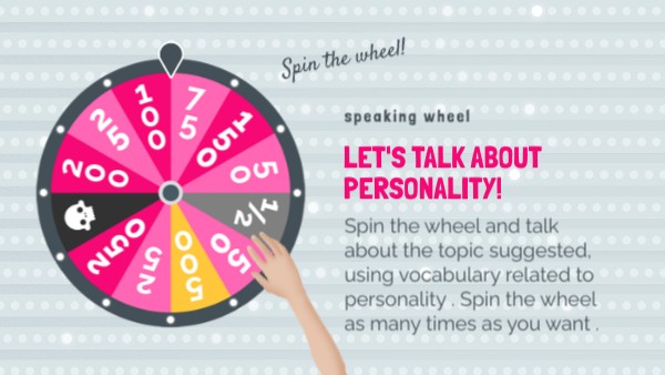 Spin the wheel and talk about the topic suggested, using vocabulary related to personality . Spin the wheel as many times as you want .