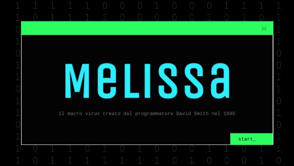 il virus melissa è stato uno delle cause di disagio maggiori nel 1999 quando internet era agli albori. Questo progetto è stato realizzato da Lambranzi Beatrice come compito di informatica con valutazone